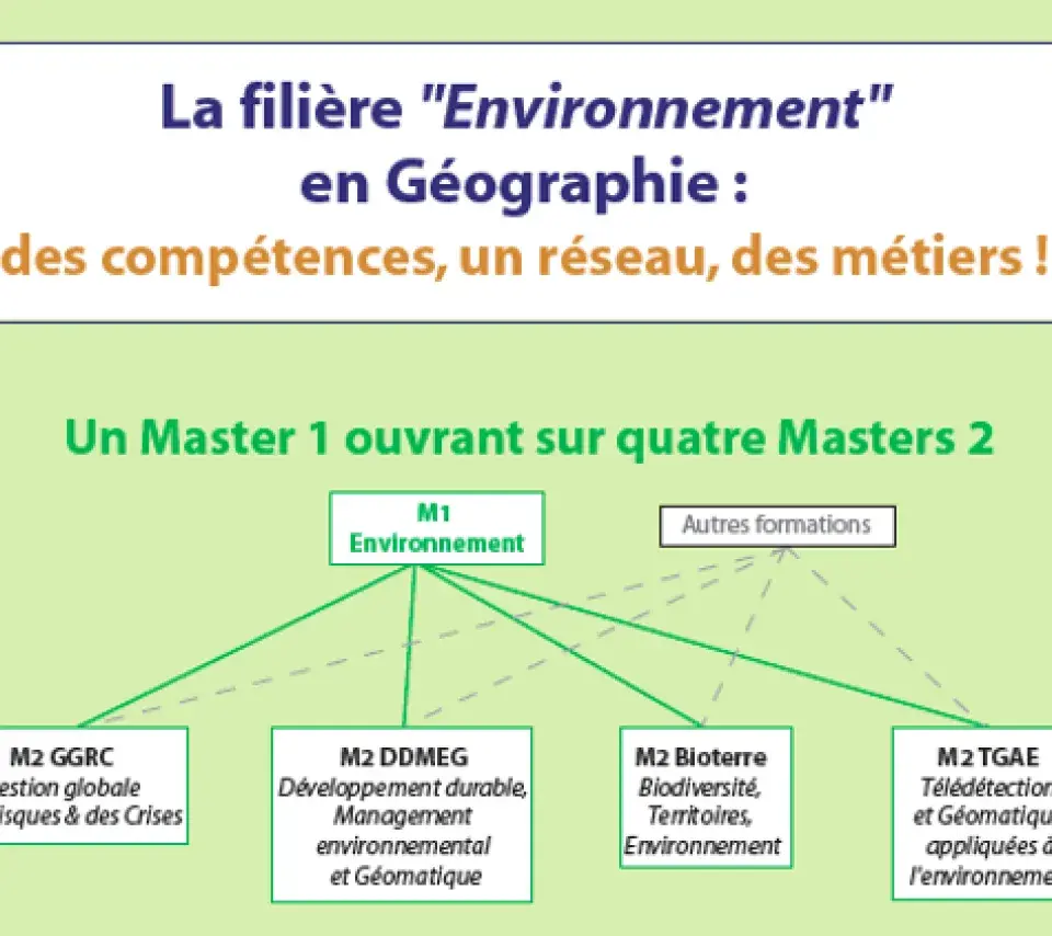 Voir la page Master GéographieTexteLa mention de master Géographie propose, en première année, un tronc commun, des options et des cours de spécialisation correspondant à six parcours différenciés de master.